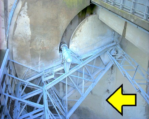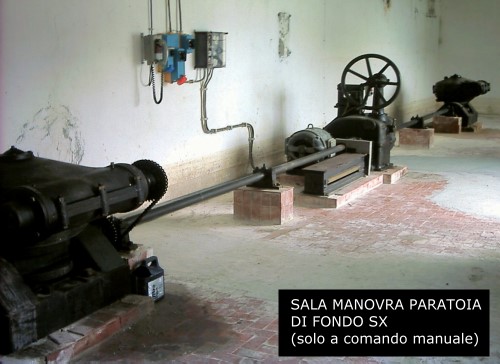 Nella cabina di manovra destra sono presenti anche le valvole a saracinesca per la chiusura manuale delle paratoie di superficie e gli organi di manovra delle valvole a spillo per l’apertura manuale delle paratoie di superficie.