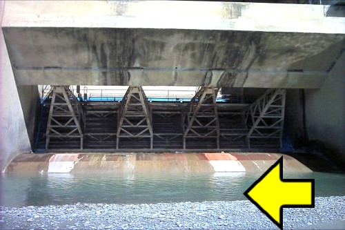 Alle estremità dello sbarramento, lateralmente alle paratoie mobili, sono installate due scaricatori di fondo, con due paratoie non automatiche, ognuna di mt 15 x3,75 poggianti su una soglia al piano più depresso dell’alveo (quota + 88,00).