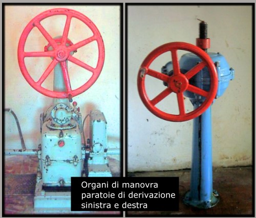 Per la derivazione principale in sponda sinistra sono installate due paratoie di diaframma piane, scorrevoli su ruote, della luce di mt 2,70 x 2,50 ognuna, manovrabili con argano a viti ed azionabili elettricamente o a mano.